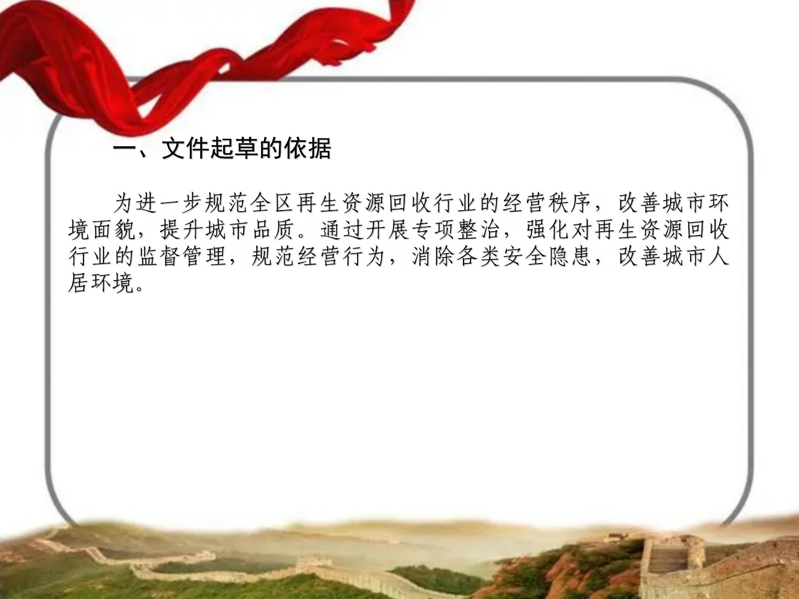 为进一步规范全区再生资源回收行业的经营秩序,改善城市环境面貌,提升城市品质。结合工作实际,制定本方案。